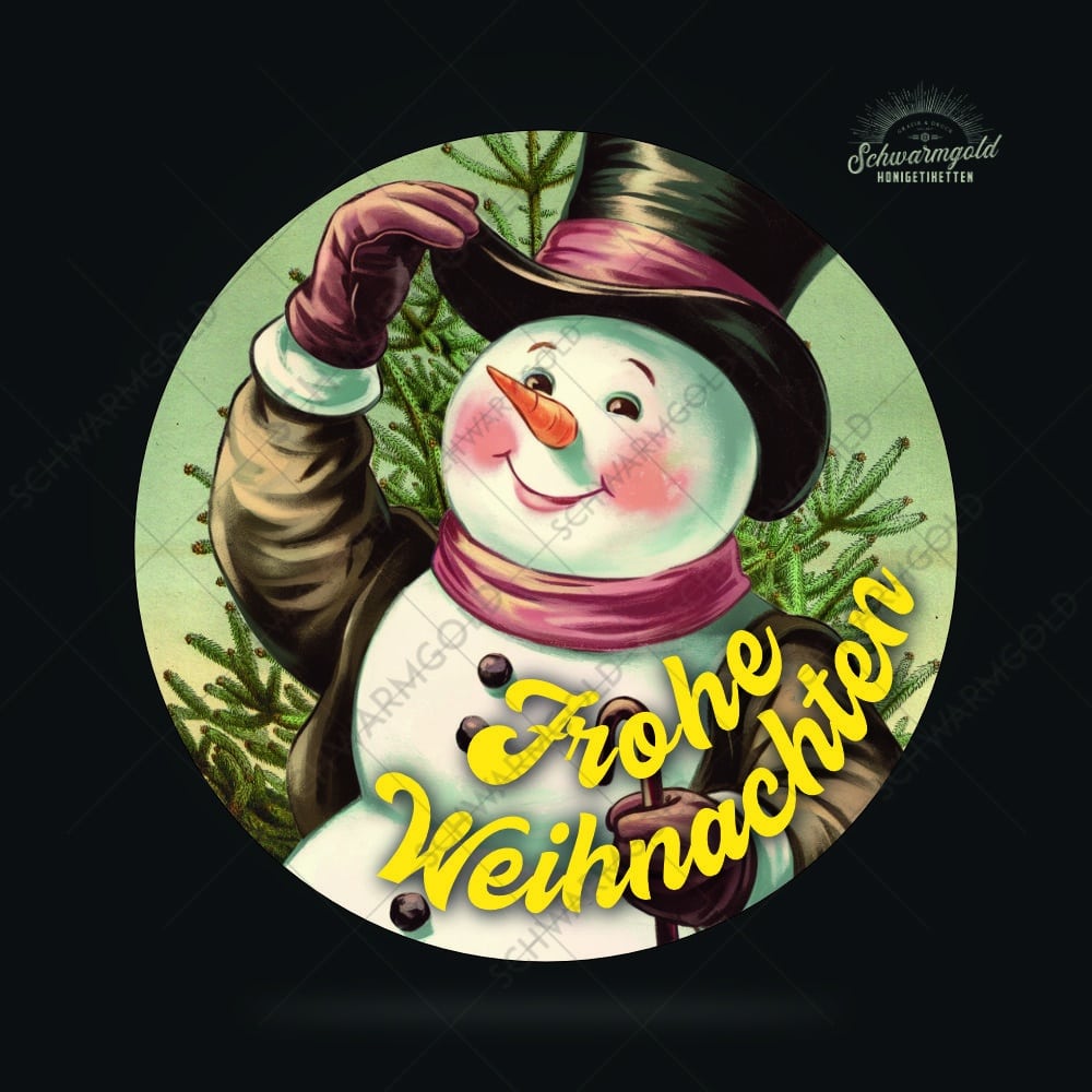 ein fröhlicher Schneemann mit Schal, Zylinder und in hangemalter Optik.